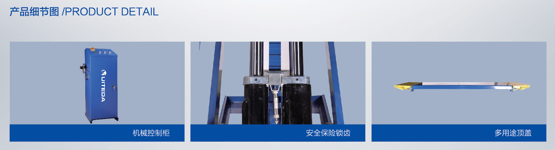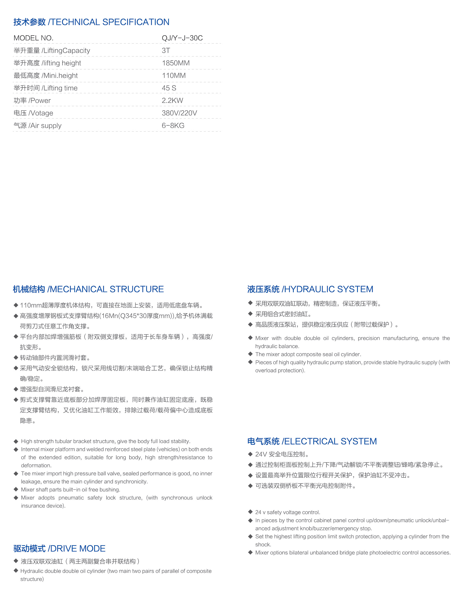 技术特点: 1、110mm超薄厚度机体结构,可直接在地面上安装,适用低底盘车辆。 2、高强度增厚钢板式支撑臂结构(16Mn(Q345*30厚度mm)),给予机体满载荷剪刀式任意工作角支撑。 3、平台内部加焊增强筋板(附双侧支撑板,适用于长车身车辆),高强度/抗变形。 4、转动轴部件内置润滑衬套。 5、采用气动安全锁结构,锁尺采用线切割/末端啮合工艺,确保锁止结构精确/稳定。 6、增强型自润滑尼龙衬套。 7、剪式支撑臂靠近底板部分加焊厚固定板,同时兼作油缸固定底座,既稳定支撑臂结构,又优化油缸工作能效,排除过载荷/载荷偏中心造成底板隐患。 二、液压系统 1、采用双联双油缸联动,精密制造,保证液压平衡。 2、采用组合式密封油缸。 3、高品质液压泵站,提供稳定液压供应(附带过载保护)。 三、驱动模式 液压双联双油缸(两主两副复合串并联结构) 四、电气系统 1、24V 安全电压控制。 2、通过控制柜面板控制上升/下降/气动解锁/不平衡调整钮/蜂鸣/紧急停止。 3、设置最高举升位置限位行程开关保护,保护油缸不受冲击。 4、可选装双侧桥板不平衡光电控制附件。 |