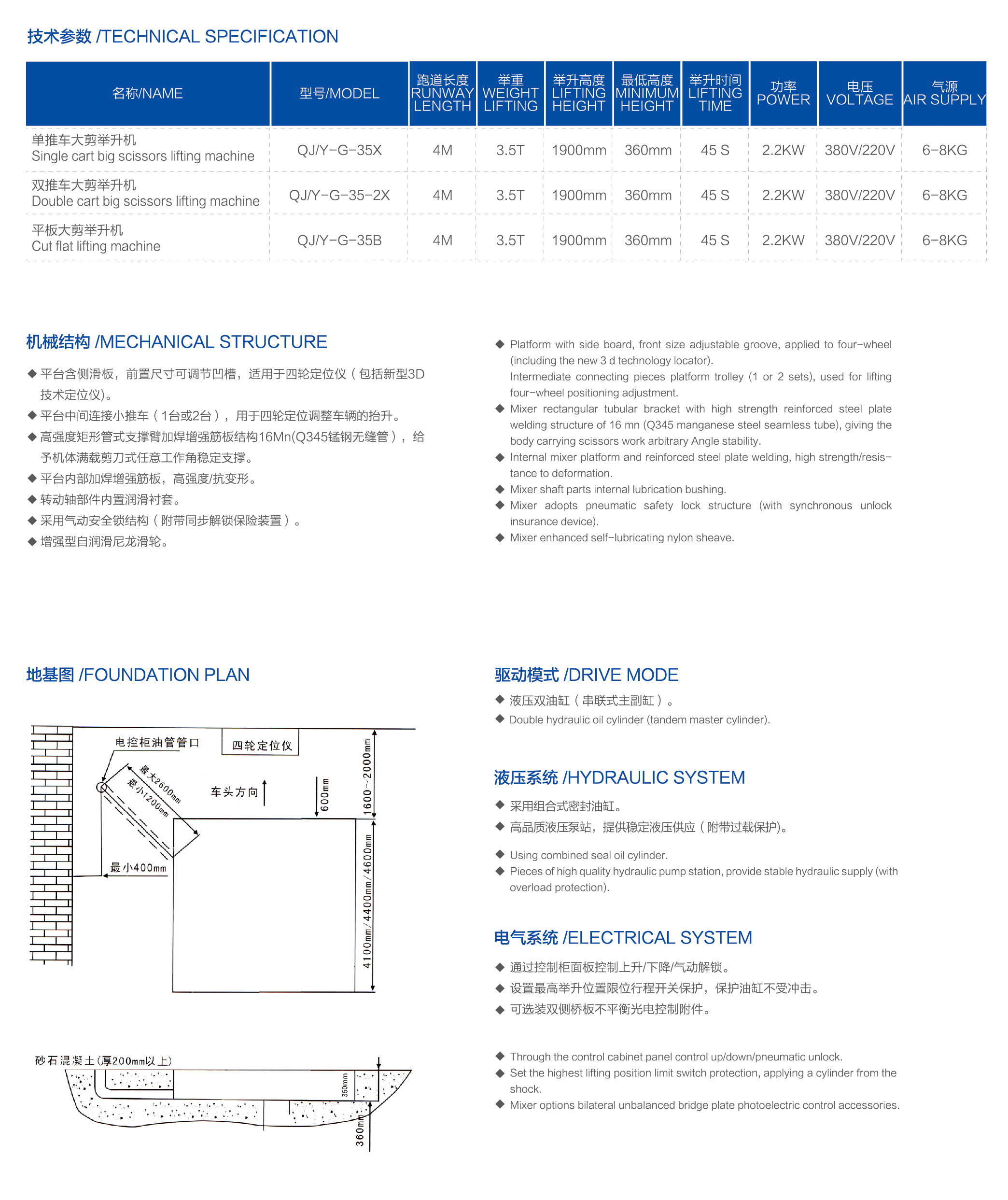 技术特点: 一、机械结构 1.平台含侧滑板,前置尺寸可调节凹槽,适用于四轮定位仪(包括新型3D技术定位仪)。 2.平台中间连接小推车(1台或2台),用于四轮定位调整车辆的抬升。 3.高强度矩形管式支撑臂加焊增强筋板结构16Mn(Q345锰钢无缝管),给予机体满载剪刀式任意工作角稳定支撑。 4.平台内部加焊增强筋板,高强度/抗变形。 5.转动轴部件内置润滑衬套。 6.采用气动安全锁结构(附带同步解锁保险装置)。 7.增强型自润滑尼龙滑轮。 二、液压系统 1.采用组合式密封油缸 2.高品质液压泵站,提供稳定液压供应(附带过载保护) 三、驱动模式 液压双油缸(串联式主副缸)