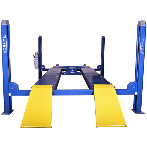 四柱举升机的特点是具有四根立柱,通过液压缸或丝杠螺母传动实现对汽车的举升。它主要用于对20t以下的各种汽车进行举升。现在常见的是加有二次举升装置的四轮定位用的四柱举升机。